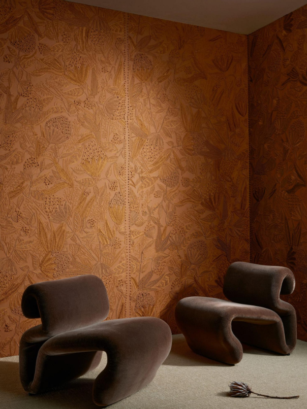 Éclosion presents a lush botanical scene, hand-embroidered on a cotton base. Amid graceful leaves, elegant flowers unfurl, their forms finished with delicate French knots. Its name evokes the poetic instant when a bud blossoms; a symbol of emerging beauty.