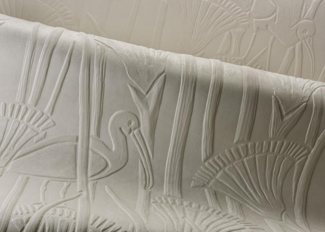 The Ibis design features tall panels depicting the verdant green riverbanks of the Nile, rendered in a soft relief textile. Among the lush foliage, the graceful ibis – a bird rich in ancient Egyptian symbolism – occasionally appears, adding a poetic touch to the design.